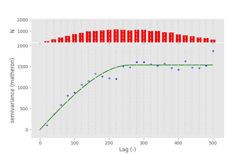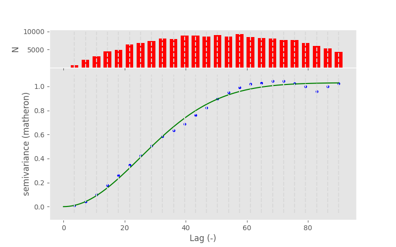 However, what we can discuss from the figure, is what a variogram actually is. At its core it relates a dependent variable to an independent variable and, in a second step, tries to describe this relationship with a statistical model. This model on its own describes some of the spatial properties of the random field and can further be utilized in an interpolation to select nearby points and weight them based on their statistical properties.