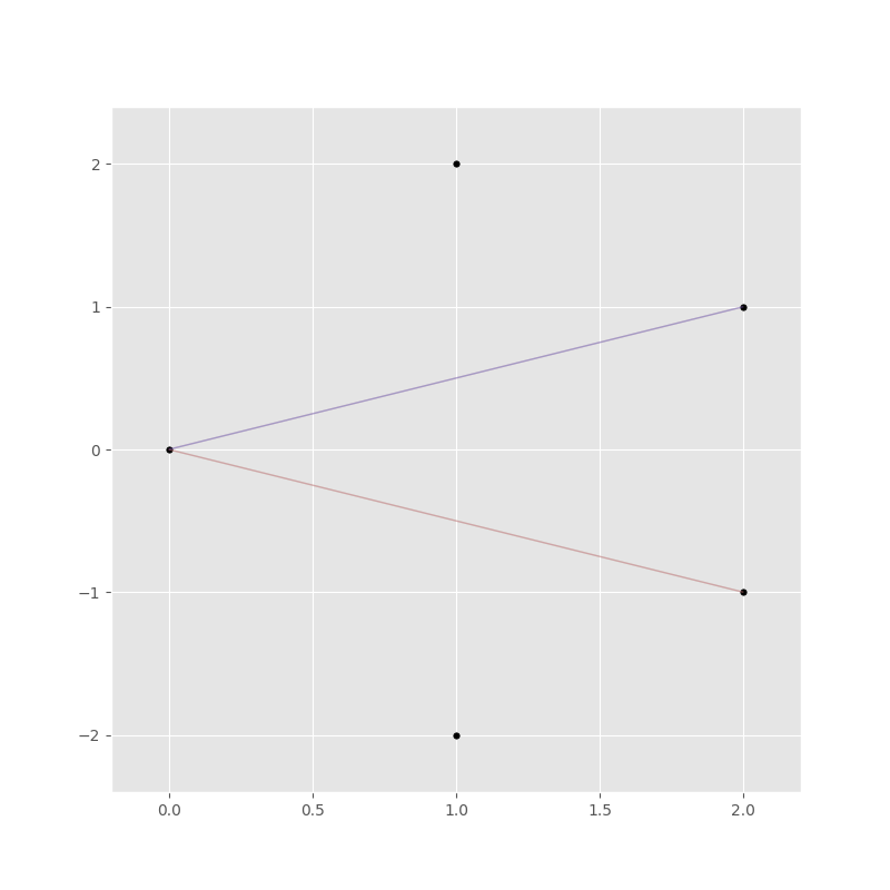 You can see, that the both points and their mirrored counterpart have the same angle to the x-axis, just like expected. This can be visualized by the plot below: